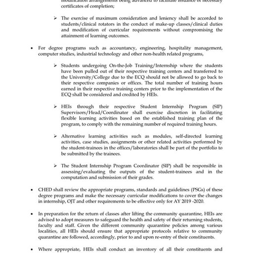 The following document is a general statement about the on-the-job training activities and internships; guidelines for HEIs using the old and new academic calendar; as well as guidelines for the preparation of HEIs for the return of classes after lifting the community quarantine.