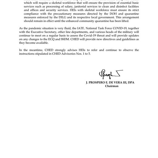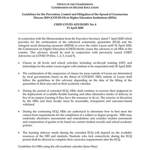 In connection with the Memorandum from the Executive Secretary dated 7 April 2020 which provides for the continuation of the enhanced community quarantine (ECQ) and the stringent social distancing measures (SSDM) to cover the entire Luzon until 30 April 2020, the Commission on Higher Education (CHED) hereby issues this advisory to all HEIs in the country. This advisory should be read in conjunction with the previously issued CHED Advisories on COVID-19 (Nos. 1-5).