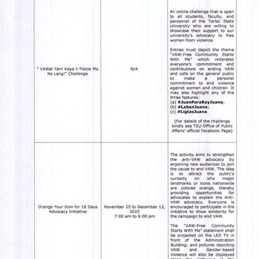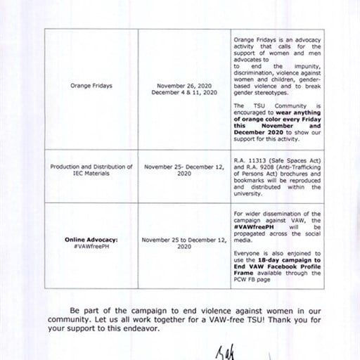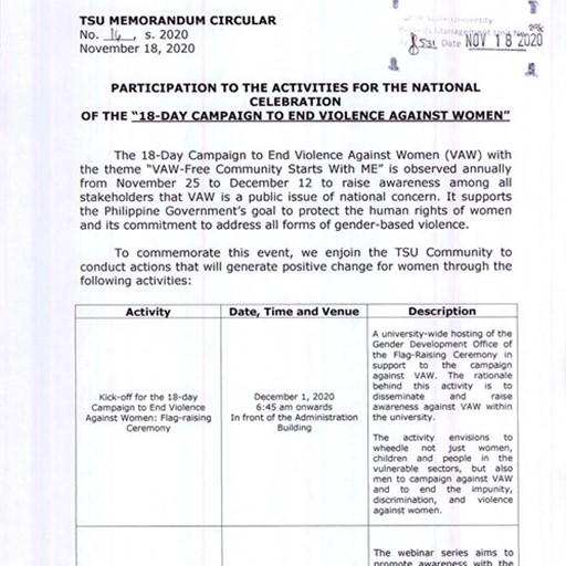 In line with this, the TSU Community is enjoined to participate with the activities prepared by the Gender and Development Office that will generate positive change for women.
