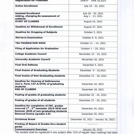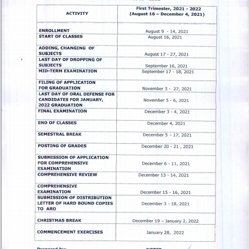 The Admission and Registration Office has released the 𝗖𝗼𝗹𝗹𝗲𝗴𝗶𝗮𝘁𝗲 𝗔𝗰𝗮𝗱𝗲𝗺𝗶𝗰 𝗖𝗮𝗹𝗲𝗻𝗱𝗮𝗿 𝗳𝗼𝗿 𝗙𝗶𝗿𝘀𝘁 𝗦𝗲𝗺𝗲𝘀𝘁𝗲𝗿 𝗔𝗬 𝟮𝟬𝟮𝟭-𝟮𝟬𝟮𝟮 and 𝗙𝗶𝗿𝘀𝘁 𝗧𝗿𝗶𝗺𝗲𝘀𝘁𝗲𝗿 𝗦𝗰𝗵𝗲𝗱𝘂𝗹𝗲 𝗳𝗼𝗿 𝘁𝗵𝗲 𝗚𝗿𝗮𝗱𝘂𝗮𝘁𝗲 𝗦𝗰𝗵𝗼𝗼𝗹 𝗔𝗬 𝟮𝟬𝟮𝟭-𝟮𝟬𝟮𝟮.