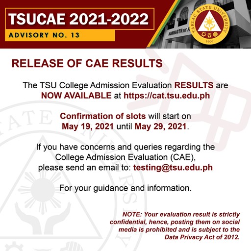 If you have concerns and queries regarding the College Admission Evaluation (CAE), please send an email to 𝘁𝗲𝘀𝘁𝗶𝗻𝗴@𝘁𝘀𝘂.𝗲𝗱𝘂.𝗽𝗵