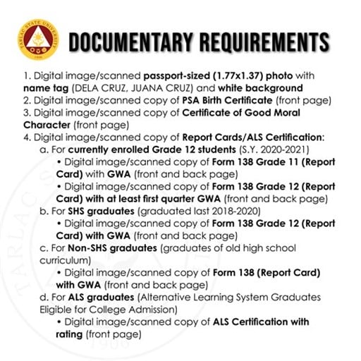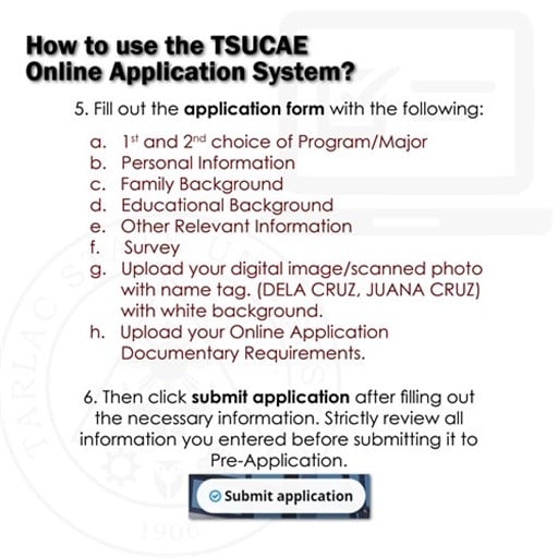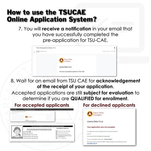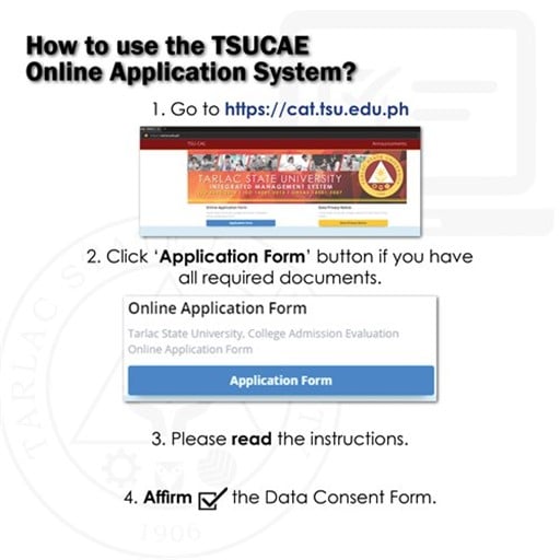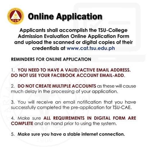 Applicants shall 𝐚𝐜𝐜𝐨𝐦𝐩𝐥𝐢𝐬𝐡 𝐭𝐡𝐞 𝐓𝐒𝐔-𝐂𝐨𝐥𝐥𝐞𝐠𝐞 𝐀𝐝𝐦𝐢𝐬𝐬𝐢𝐨𝐧 𝐄𝐯𝐚𝐥𝐮𝐚𝐭𝐢𝐨𝐧 𝐎𝐧𝐥𝐢𝐧𝐞 𝐀𝐩𝐩𝐥𝐢𝐜𝐚𝐭𝐢𝐨𝐧 𝐅𝐨𝐫𝐦 and 𝐮𝐩𝐥𝐨𝐚𝐝 𝐭𝐡𝐞 𝐬𝐜𝐚𝐧𝐧𝐞𝐝 𝐨𝐫 𝐝𝐢𝐠𝐢𝐭𝐚𝐥 𝐜𝐨𝐩𝐢𝐞𝐬 𝐨𝐟 𝐭𝐡𝐞𝐢𝐫 𝐜𝐫𝐞𝐝𝐞𝐧𝐭𝐢𝐚𝐥𝐬/𝐫𝐞𝐪𝐮𝐢𝐫𝐞𝐦𝐞𝐧𝐭𝐬 at https://cat.tsu.edu.ph/. See detailed instructions for online application on the attached images below.