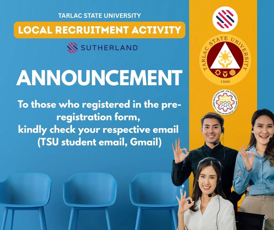Tarlac State University, in partnership with Sutherland, invites all students who completed the pre-registration for the Local Recruitment Activity to check their student or personal emails for their schedule/timeslot to streamline the process.