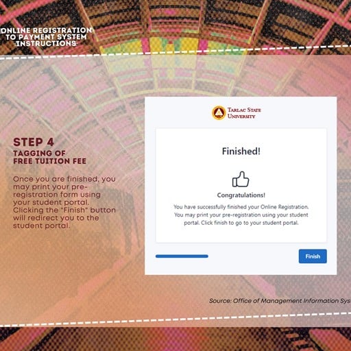 See this post for the steps: https://www.facebook.com/TarlacStateU/posts/pfbid037aC9QLntsVc2iMBZyiKmiqeZDY9biB4mvcru17YoGZf6DB9r7zWumKKWR5owrpoyl