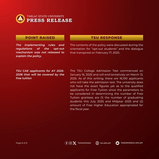 The Tarlac State University administration initiated a dialogue among student representatives on February 17, 2025 (Monday), at the Main audio-visual room, concerning comments on payment deadlines for students covered by the opt-out mechanism.