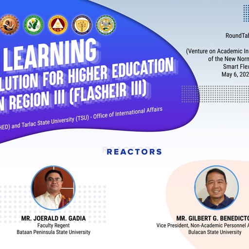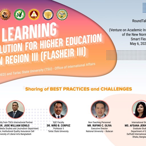 To ensure continuous partnerships among higher education institutions in Region III to address flexible learning concerns towards becoming a smart and resilient academic community, Tarlac State University organized a roundtable discussion in cooperation with the Commission on Higher Education and the TSU Office of International Affairs held today (May 6) via Zoom and Facebook Live.