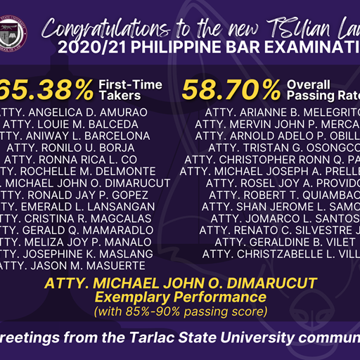Tarlac State University School of Law garnered a 65.38% passing percentage for first time takers and an overall passing rate of 58.70% with a total of 27 new TSUian lawyers in the 2020/21 Bar Examinations.